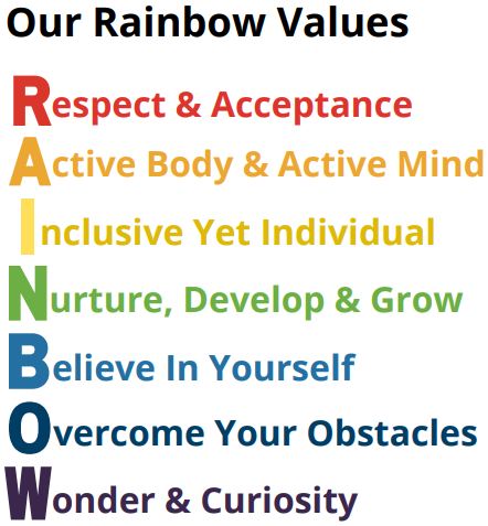 Our knowledge-based curriculum aims to provide our children with an enriching and broad curriculum, which exposes children to a range of experiences. Throughout the curriculum, you will see our Rainbow Values and the British Values woven through all learning.