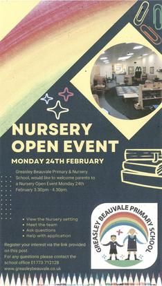 If you, or someone you know, is considering Greasley Beauvale Primary and Nursery School for their nursery aged child, please book a place on our nursery open event taking place on Monday 24th February from 3:30pm-4:30pm by completing and submitting this form, https://forms.office.com/e/jpbs34AeXg