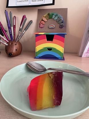 Today, they have been learning about our Rainbow Values. They have done this through hand colour mixing and making Rainbow jelly!