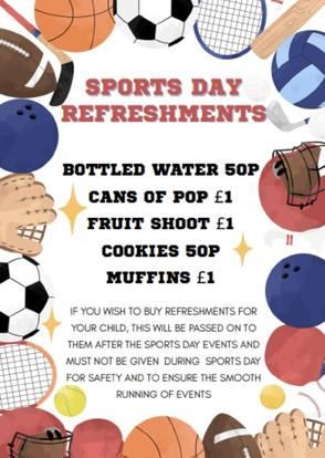 Our refreshments will be available in the school hall on the day. Please do not pass refreshments to your children during the events, there will be time for them to enjoy these in their classrooms after the events are finished.